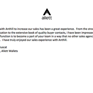![]() "I am highly satisfied with your work and I will be recommending you highly to my fellow hardware startups." - Sam Force VP of Sales Roadie | ![]() "..from the strong lines of communication to the extensive book of qualified buyers, I have been impressed. I have truly enjoyed our sales experience with Ant Hill." - Bridget Muscat President Allett Wallets |